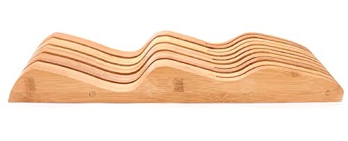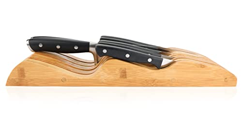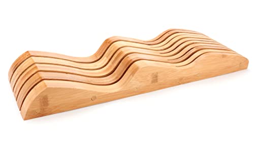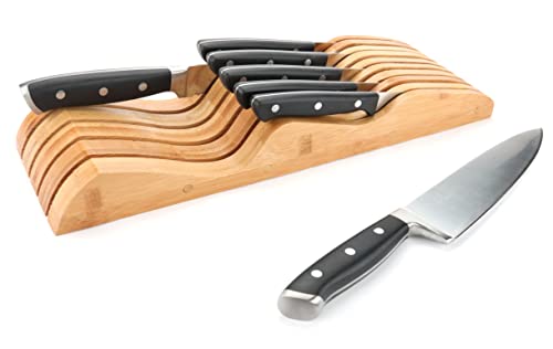 - FITS MOST STANDARD DRAWERS – say goodbye to knives shooting out of your drawer or jamming it. This in-drawer knife holder will fit effortlessly into your drawer and organize a wide range of knives