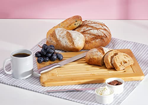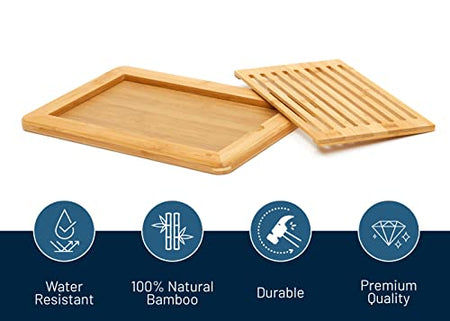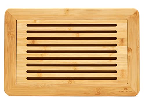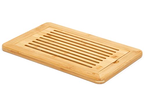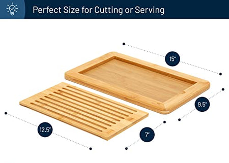Details: Large Premium Natural Bamboo Bread Cutting and Serving Board Natural Bamboo: Durable and strong, one of the most renewable resources in the world, bamboo is also gentle on knives, keeping blades sharp. Multi-Purpose/b>: This bamboo cutting board is ideal for cutting, slicing, and chopping a variety of foods in the kitchen. This board can also be used as a serving platter for cheese, meats, olives, breads and any other appetizer. Catch Your Crumbs/b>: This bread board features a convenient nesting crumb catcher that can be easily cleaned. Easy Care/b>: For long-lasting performance, hand washing with warm water and a mild detergent is recommended. Dry immediately. Ideal Gift For All Occasions/b>: The unique and creative design makes our bread cutting board perfect gift for birthdays, weddings, holidays, and housewarming.